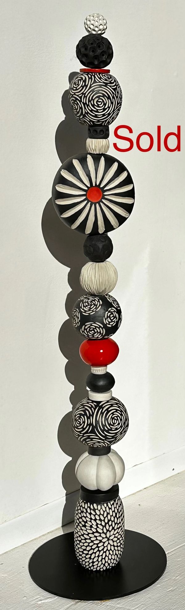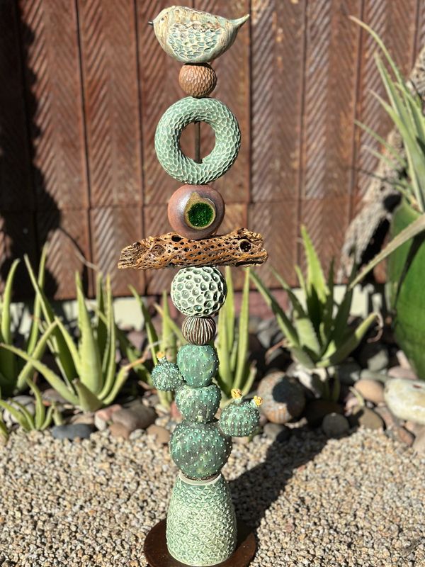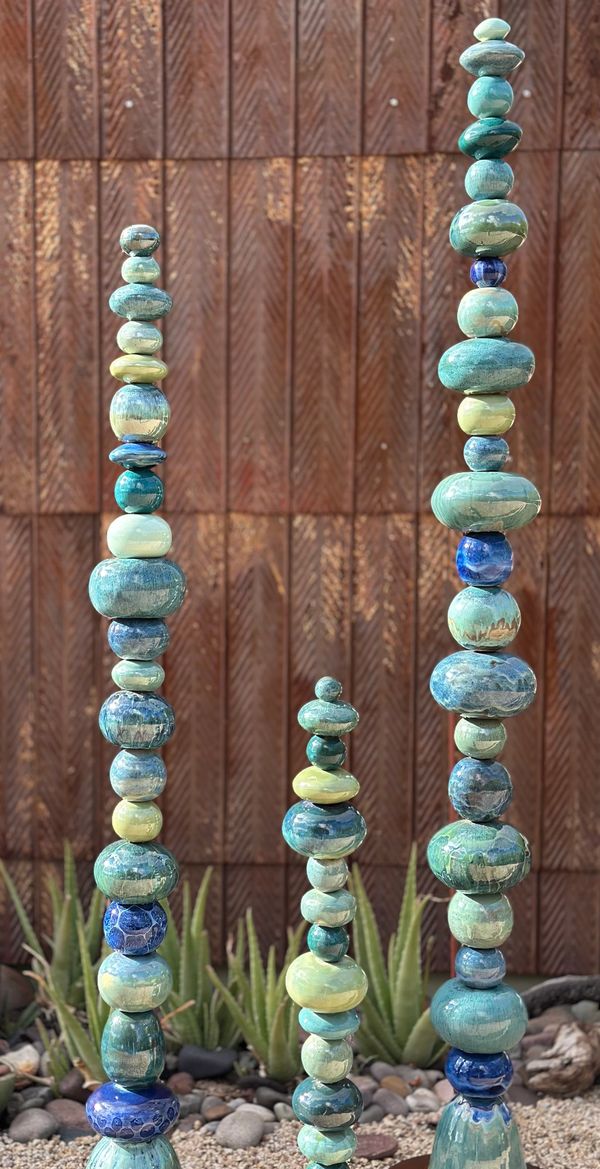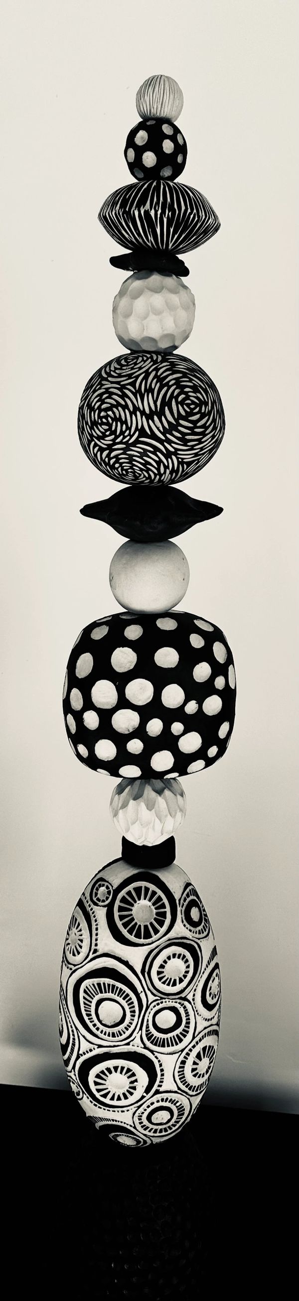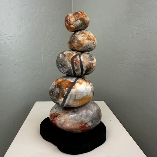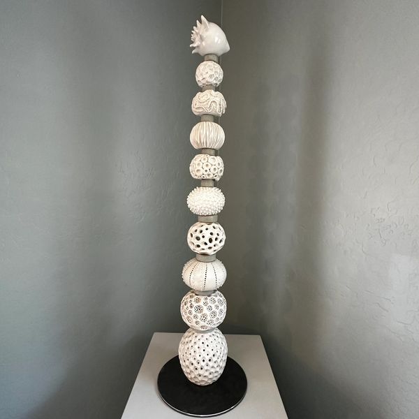 My series of totems draws its inspiration from the captivating world of rock cairns, a form of stacked rocks that I first encountered in the breathtaking landscapes of Sedona, Arizona. This series comprises several distinct themes, each embodying its own unique character. From the black and white totems, where nature's shapes and textures take on a modern twist, to the ceramic rock cairns that capture the essence of river rocks, jasper, and agate through a spectrum of beautiful glazes, my passion for collecting rocks since childhood is vividly expressed. The ocean-inspired totems offer a range of unique shells, skillfully wheel-thrown and transformed to bring the essence of these environments to life. Each totem within this series is a one-of-a-kind piece, reflecting the beauty and diversity of nature.